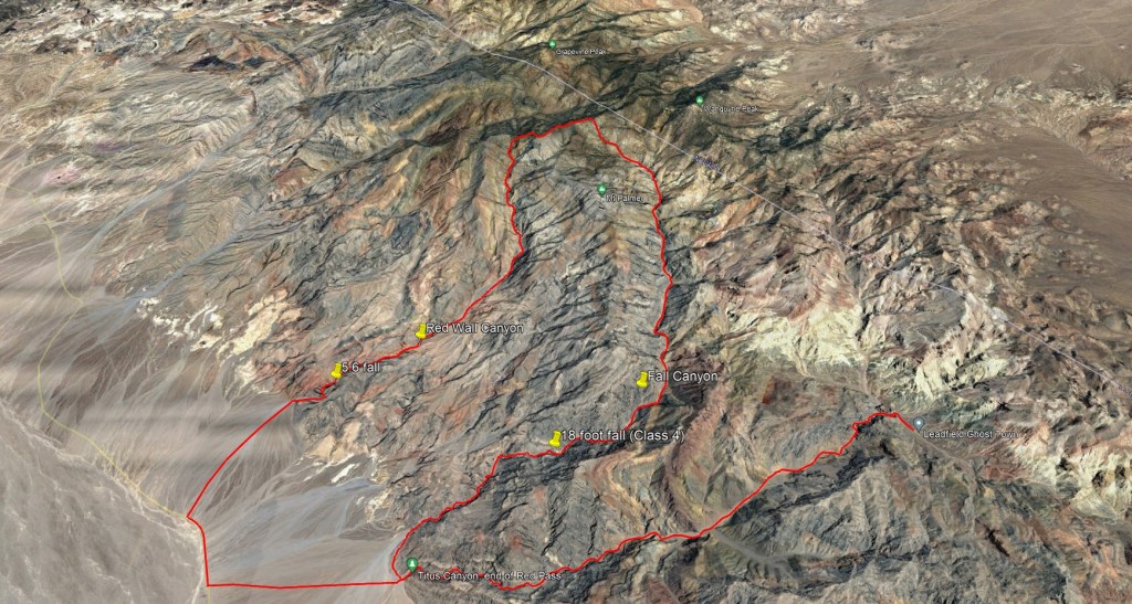 The frustrating aspect of this episode, and that which threw us off the most, was the omission of this obstacle from Digonnet’s book, with only the passing comment that the upper canyon above the junction to the Titus Canyon side canyon should be a piece of cake. In fact, this was both the most dangerous and technically challenging obstacle we would encounter. Later we would meet another hiker, Aaron, who would remark that he had only heard of people descending it with ropes. The lower dry fall bypass would prove no contest to this unnamed obstacle.
